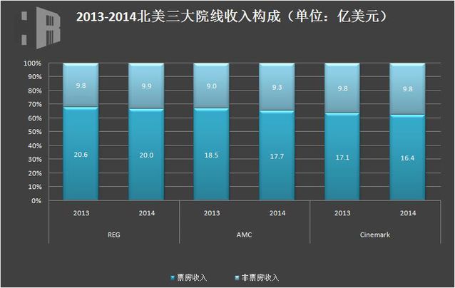 根據(jù)華誼兄弟研究院此前的一項研究,北美三大院線近兩年的票房收入占比平均數(shù)為65.6%,非票房收入占比為34.4%。萬達院線在非票房收入方面與北美的前輩們相比,雖仍有距離,但與國內(nèi)同行比起來足可算得上是先進代表了。