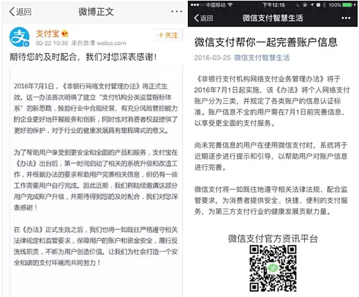受到央行新規(guī)的約束,支付寶、微信支付等網(wǎng)絡(luò)支付平臺為了保證用戶在7月1日后依然能順利使用現(xiàn)有支付服務(wù),因此紛紛開始行動。