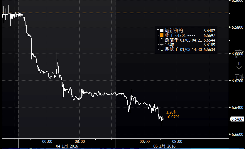 2016年開年頭兩個(gè)交易日,離岸人民幣走勢:貶值近800基點(diǎn)