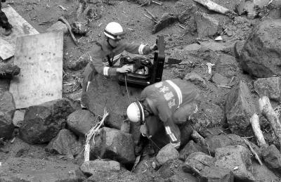 官兵利用“蛇眼生命探測(cè)儀”對(duì)任務(wù)區(qū)進(jìn)行搜救(手機(jī)拍攝)。 8日5時(shí)許,福建三明市泰寧縣開(kāi)善鄉(xiāng)發(fā)生山體滑坡,造成池潭水電廠一座辦公樓被沖垮、一座項(xiàng)目工地住宿工棚被埋壓。截至20時(shí)30分,泰寧山體滑坡失聯(lián)人數(shù)增加至41人,其中屬中國(guó)水利水電十六局35人、中國(guó)水利水電十二局6人。初步了解滑坡原因,可能是近日連續(xù)大雨所致。 □突發(fā) 大型泥石流沖毀廠區(qū)辦公大樓 7日至8日,泰寧縣普降暴雨到大暴雨,局部地區(qū)24小時(shí)降雨量達(dá)191.6毫米。8日凌晨5時(shí)左右,突發(fā)10萬(wàn)立方米以上大型自然災(zāi)害泥石流,泥石流沖毀了池潭水電廠擴(kuò)建工程施工單位生活營(yíng)地,同時(shí)沖毀了池潭水電廠廠區(qū)辦公大樓。因時(shí)值凌晨,大部分工友都在熟睡,最初統(tǒng)計(jì)有35人失聯(lián)。截至13時(shí),已造成7人受傷。這7名工人中有兩名沒(méi)有明顯的外傷,其他5人均有不同程度的傷,一人是手外傷,一人是腳外傷,一人是腰傷,一人是髖骨骨折,還有一人是雙下肢的骨折。目前受傷的工人已經(jīng)緊急送往醫(yī)院進(jìn)行治療。 昨晚9時(shí)許,福建省三明市泰寧縣召開(kāi)“5·8”泥石流自然地質(zhì)災(zāi)害新聞發(fā)布會(huì)。會(huì)上相關(guān)負(fù)責(zé)人介紹,截至晚9時(shí),泰寧山體滑坡失聯(lián)人數(shù)增加至41人,其中屬中國(guó)水利水電十六局35人、中國(guó)水利水電十二局6人。事故發(fā)生后,新增的5名傷員不在失聯(lián)人員名單當(dāng)中。目前救援仍在緊張進(jìn)行。 泰寧縣旅游管委會(huì)研究決定,從5月8日7時(shí)起,泰寧縣所有景區(qū)暫時(shí)關(guān)閉。泰寧縣旅游管委會(huì)表示,請(qǐng)游客不要前往景區(qū),景區(qū)開(kāi)放時(shí)間另行通知。 國(guó)土資源部啟動(dòng)地質(zhì)災(zāi)害Ⅱ級(jí)應(yīng)急響應(yīng) 三明市泰寧縣山體滑坡發(fā)生后,國(guó)土資源部立即召開(kāi)緊急會(huì)議,研究部署落實(shí)黨中央、國(guó)務(wù)院領(lǐng)導(dǎo)批示精神。國(guó)土資源部聯(lián)合民政部(國(guó)家減災(zāi)委)、水利部(國(guó)家防辦)、國(guó)資委、國(guó)家安監(jiān)總局成立國(guó)務(wù)院工作組,指導(dǎo)地方做好救援工作。目前工作組各成員正陸續(xù)趕赴災(zāi)害現(xiàn)場(chǎng)。 國(guó)土資源部第一時(shí)間啟動(dòng)地質(zhì)災(zāi)害Ⅱ級(jí)應(yīng)急響應(yīng),專家組趕赴災(zāi)害現(xiàn)場(chǎng),提供技術(shù)支持,協(xié)助指導(dǎo)地方政府開(kāi)展地質(zhì)災(zāi)害應(yīng)急調(diào)查。國(guó)土資源部要求福建省國(guó)土資源廳進(jìn)一步了解核實(shí)災(zāi)情,包括災(zāi)害性質(zhì)、人員傷亡等。要千方百計(jì)施救失聯(lián)人員,對(duì)災(zāi)害周邊區(qū)域進(jìn)行全面排查,劃定危險(xiǎn)區(qū),加強(qiáng)監(jiān)測(cè)預(yù)警,嚴(yán)防二次災(zāi)害。 □追問(wèn) 是否大雨導(dǎo)致山體滑坡? 初步了解滑坡原因,可能是近日連續(xù)大雨所致。來(lái)自福建省泰寧縣政府的消息,7日至8日,泰寧縣普降暴雨到大暴雨,局部地區(qū)24小時(shí)降雨量達(dá)191.6毫米。 8日凌晨5時(shí)左右,突發(fā)10萬(wàn)方以上大型自然災(zāi)害泥石流,泥石流沖毀了池潭水電廠擴(kuò)建工程施工單位。 失蹤的是哪些人員? 來(lái)自福建省泰寧縣政府的消息,失蹤人員參與的是池潭水電廠擴(kuò)建工程,其施工單位為中水十六局、中水十二局。8日凌晨5時(shí)左右,泥石流沖毀了生活營(yíng)地,及池潭水電廠廠區(qū)辦公大樓。因時(shí)值凌晨,大部分工人都在熟睡。 目前救援情況如何? 據(jù)了解,三明市組織市級(jí)和相鄰縣醫(yī)院的16輛救護(hù)車及60多名醫(yī)務(wù)人員到現(xiàn)場(chǎng)救援,相關(guān)醫(yī)院已安排搶救室、醫(yī)務(wù)人員和16萬(wàn)毫升血液血漿等候急救;市、縣消防部隊(duì)已調(diào)集13輛車和100多名消防官兵攜帶生命探測(cè)儀等施救設(shè)備展開(kāi)救援,300多名縣、鄉(xiāng)干部在現(xiàn)場(chǎng)參與施救,另有40余臺(tái)工程機(jī)械正趕往現(xiàn)場(chǎng)。 武警交通部隊(duì)迅速啟動(dòng)應(yīng)急預(yù)案,派出駐福州的一大隊(duì)86名專業(yè)救援兵力,攜帶推土機(jī)、挖掘機(jī)等30臺(tái)大型裝備及生命探測(cè)儀等趕赴現(xiàn)場(chǎng)救援;同時(shí),武警交通指揮部、武警交通三總隊(duì)同期派出兩路應(yīng)急救援技術(shù)專家組,分別從北京、合肥趕赴一線,為受災(zāi)群眾和救災(zāi)部隊(duì)提供技術(shù)支持和后勤保障。 8日下午5時(shí)許,記者隨武警部隊(duì)徒步到達(dá)事發(fā)現(xiàn)場(chǎng),看到武警、消防官兵及當(dāng)?shù)鼐仍α康任辶偃苏诰o張施救,十多輛挖掘機(jī)在現(xiàn)場(chǎng)挖掘。 事故現(xiàn)場(chǎng)地面上隨處可見(jiàn)大石頭、泥土,以及彎曲的鋼筋,搜救犬正在搜尋失聯(lián)人員。據(jù)現(xiàn)場(chǎng)的武警戰(zhàn)士介紹,武警部隊(duì)采取機(jī)械加人工的辦法,正在現(xiàn)場(chǎng)積極展開(kāi)救援。在事故現(xiàn)場(chǎng),停著十多輛救護(hù)車和部隊(duì)車輛,隨時(shí)準(zhǔn)備救援。目前,雨時(shí)斷時(shí)續(xù),給救援帶來(lái)了很大的困難。
