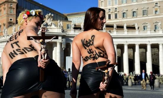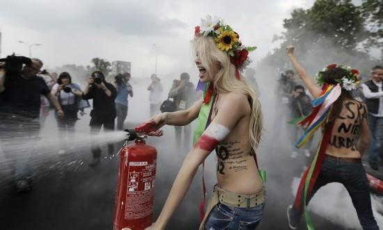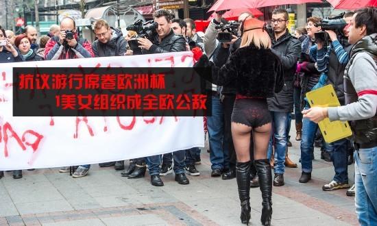 嘗到甜頭后,她們開(kāi)始頻繁在歐洲杯的重要時(shí)間節(jié)點(diǎn)出現(xiàn):2011年6月,她們?cè)谏砩现?012歐洲杯拒絕賣淫”,攪亂了歐洲杯倒計(jì)時(shí)一周年活動(dòng);7月,她們身涂彩繪,手捧足球,在噴泉中洗浴抗議烏克蘭可能因?yàn)橥獾厍蛎源罅坑咳攵鴷和>用裣募緹崴?yīng)……