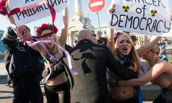 在基輔,每天都有集會(huì),總有人拿著擴(kuò)音器吶喊,總有人揮舞旗幟,組織各種規(guī)模的抗議。有媒體形容該組織“一脫成名”,也有媒體稱其為“民權(quán)斗士”。以身體作為政治抗?fàn)幍奈淦?這種出位行為招致不少爭(zhēng)議。但漢娜認(rèn)為,惟一讓她們的訴求被聽(tīng)見(jiàn)的方法,就是“脫掉衣服”。