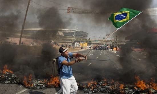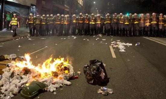 在圣保羅,5000名工人走上街頭,走到世界杯揭幕戰(zhàn)(6月12日巴西VS克羅地亞)的科林蒂安球場(chǎng)前焚燒輪胎,警察向其發(fā)射催淚瓦斯和橡皮子彈。