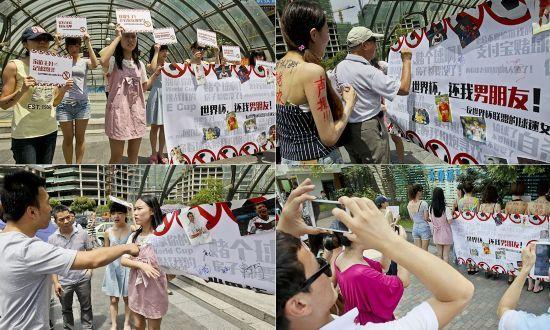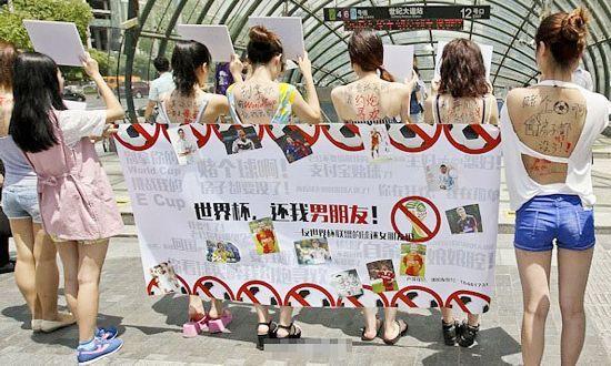 她們?cè)谑兰o(jì)大道地鐵站外、人民公園外和美羅城外抗議,舉牌號(hào)召“世界杯,還我男朋友”,還寫上了各種各樣控訴“標(biāo)語(yǔ)”,例如“別拿你的WorldCup挑戰(zhàn)我的ECup”、“輸球了別拉我自殺”、“在辦公室談足球的男人都是娘娘腔”、“家庭主婦≠足球怨婦”和“我要生了!老公你在哪里?”。