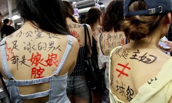 【上海女子游行反世界杯】2014年7月8日,巴西世界杯將迎來(lái)半決賽的到來(lái),上海男球迷們的視線就沒(méi)從屏幕上移開(kāi)過(guò),這讓他們的女朋友覺(jué)得被忽略了。因此上海的12名女子組成了“反世界杯聯(lián)盟”,她們拉起橫幅并在身上寫了標(biāo)語(yǔ),走上街頭游行來(lái)表達(dá)不滿。