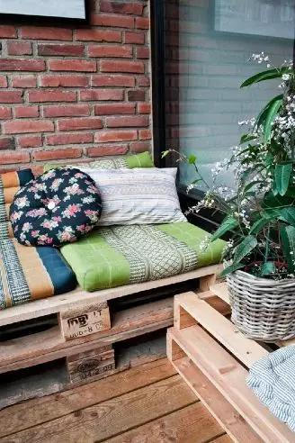 如果只需滿足坐著看書的需要,一把上好的椅子足矣(圖中的顯然不夠舒服…),百葉窗和窗邊小擱板都是亮點(diǎn)。你看書不妨礙我種花,看書累了,抬起頭就是一片蔥郁。如果家里準(zhǔn)備裝修,可以考慮將小陽臺(tái)做高一級變身榻榻米閱讀角;如果家已成型,只能小打小鬧地改造,照樣可以鋪上戶外地板增加親膚感。此時(shí)透光竹簾比百葉窗更搭~陽臺(tái)小,更要每一寸地兒都要用好!在這里,轉(zhuǎn)角書桌將陽臺(tái)的死角活用起來,構(gòu)成了一個(gè)圍合的工作區(qū),對于家里沒有書房又需要工作區(qū)的小兩口很有借鑒意義??梢圆扇蓮堥L桌拼合的方式實(shí)現(xiàn)。如果陽臺(tái)實(shí)在太窄做不了轉(zhuǎn)角書桌,利用一整面墻的垂直空間也是極好的,而且全部使用隔板實(shí)現(xiàn),費(fèi)用不會(huì)很高。6▲ 木卡板+坐墊+抱枕還記得周二的「家的畫面」里提及的“木托盤”嗎,對于陽臺(tái)改造,依舊是萬能的!某寶搜索關(guān)鍵詞#木卡板#,像圖中這樣的砌法兩張毛爺爺左右搞掂。如果用在陽臺(tái),記得要買通過防潮防腐標(biāo)準(zhǔn)的。
